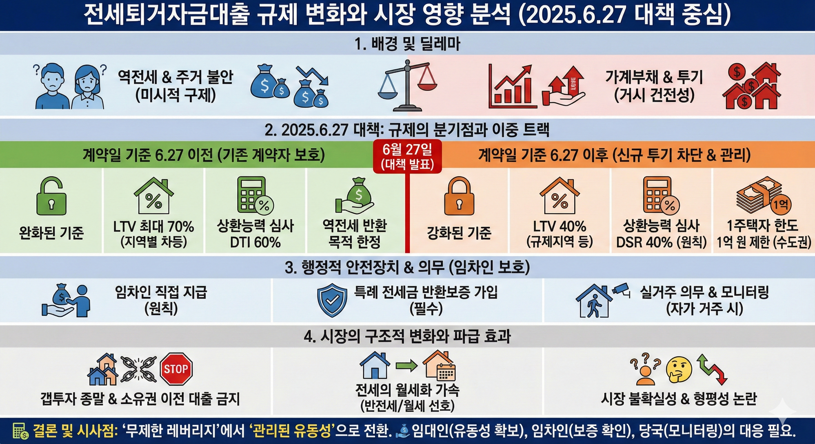 본 보고서는 이러한 정책적 딜레마가 정점에 달했던 2025년 6월 27일 부동산 대책(이하 ‘6.27 대책’)을 기점으로, 전세퇴거자금대출(전세보증금 반환대출) 규정이 어떻게 세분화되고 재편되었는지를 심층적으로 연구하였습니다.