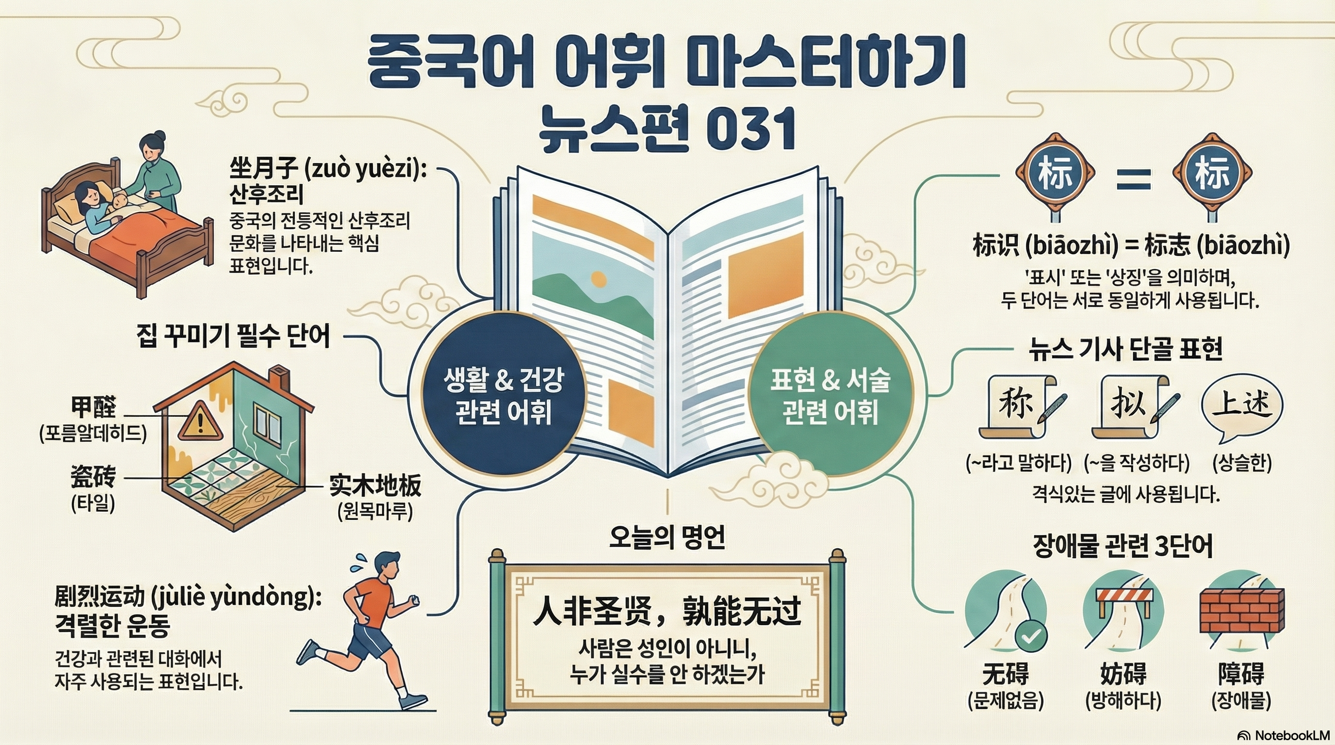 오늘은 실제 뉴스 강의 자료(啥都不怕 뉴스편 031)를 바탕으로, 실생활과 밀접하면서도 뉴스 청취에 필수적인 핵심 어휘들을 심층 분석해보고자 합니다. 이번 강의의 키워드는 ‘인테리어’, ‘건강’, 그리고 ‘사과(Apology)’입니다.